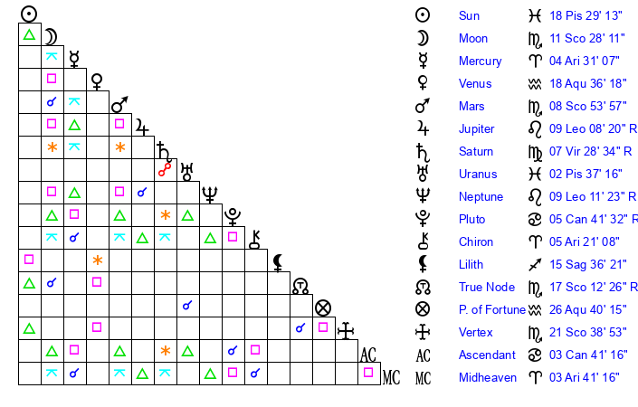 | Moon | 11 Scorpio 23 | 22 Cancer 13 | 19 Virgo 27 |