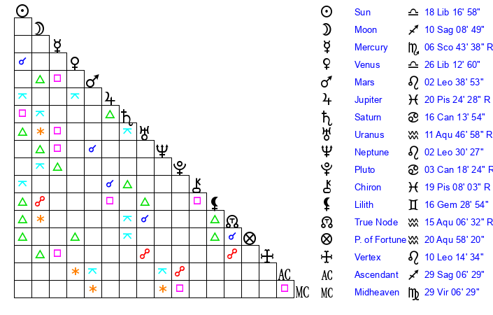 | Sun | 18 Libra 17 | 19 Libra 37 | 9 Aquarius 29 |