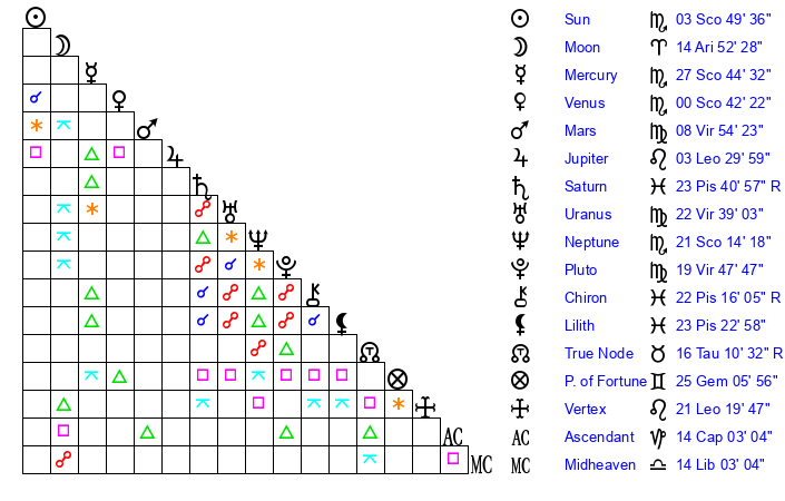 Sun | 3 Scorpio 50 | 4 Scorpio 46 | 2 Capricorn 27 |