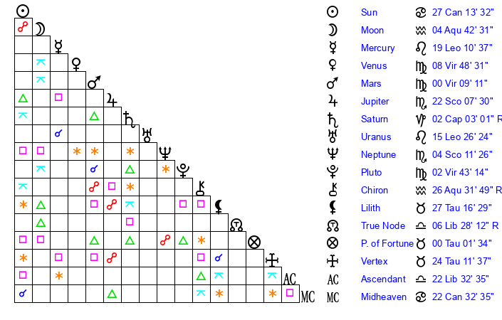 | Jupiter | 21 Scorpio 59 | 9 Cancer 16 | 28 Scorpio 0 |