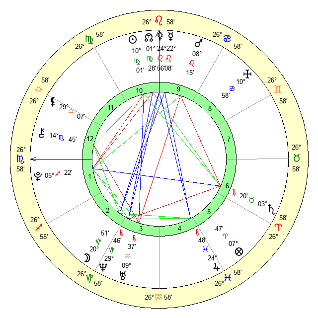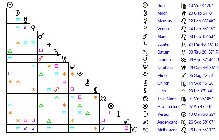 Venus | 24 Leo 56 | 9 Leo 36 | 28 Virgo 26 |