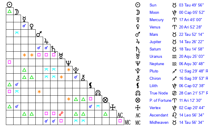 Jupiter | 14 Taurus 30 | 19 Gemini 56 | 20 Taurus 26 |