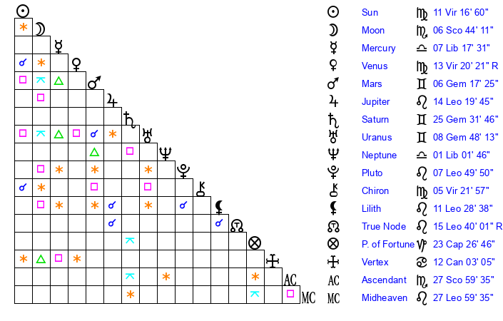 | Sun | 11 Virgo 17 | 12 Virgo 25 | 2 Sagittarius 33 |