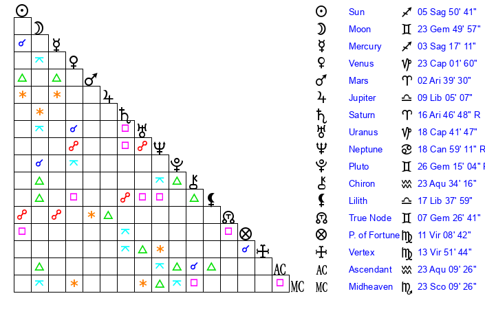 | Sun | 5 Sagittarius 51 | 6 Sagittarius 57 | 2 Aries 11 |