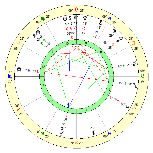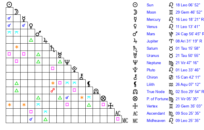 | Mercury | 16 Leo 18 | 4 Leo 15 | 5 Sagittarius 15 |
