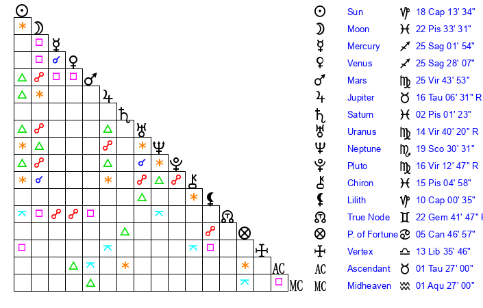 Pluto | 16 Virgo 13 | 1 Aquarius 18 | 14 Virgo 56 |