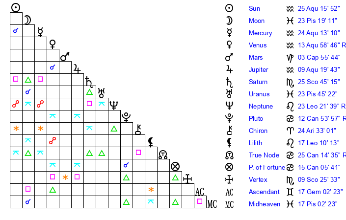 | Sun | 25 Aquarius 16 | 26 Aquarius 15 | 2 Gemini 45 |