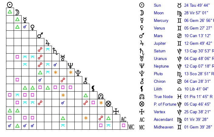 Moon | 28 Virgo 55 | 28 Sagittarius 30 | 16 Capricorn 42 |