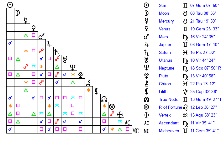 Venus | 19 Gemini 24 | 21 Aries 48 | 2 Virgo 32 |