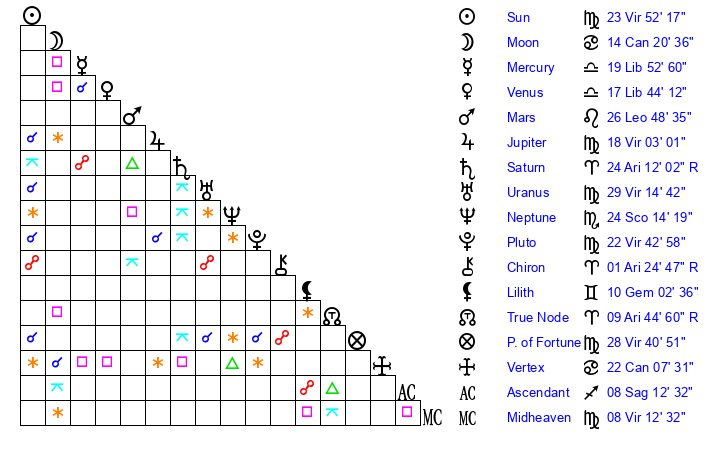 Sun | 23 Virgo 52 | 24 Virgo 5 | 20 Scorpio 23 |
