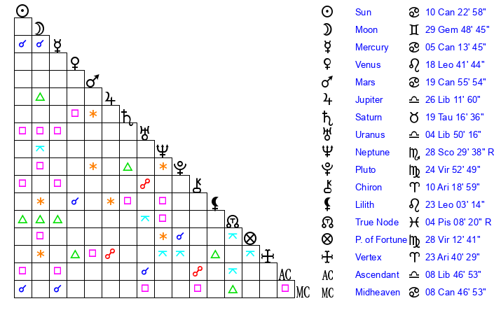 | Moon | 29 Gemini 39 | 9 Libra 59 | 6 Cancer 10 |