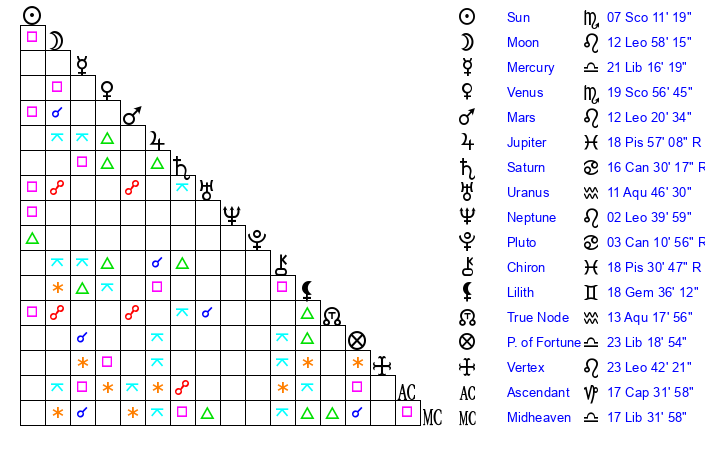 | Moon | 12 Leo 56 | 2 Pisces 57 | 24 Leo 15 |