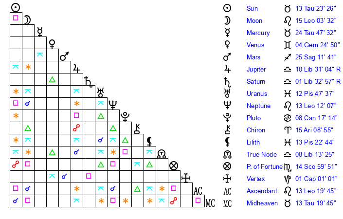 | Sun | 13 Taurus 23 | 14 Taurus 26 | 22 Leo 1 |
