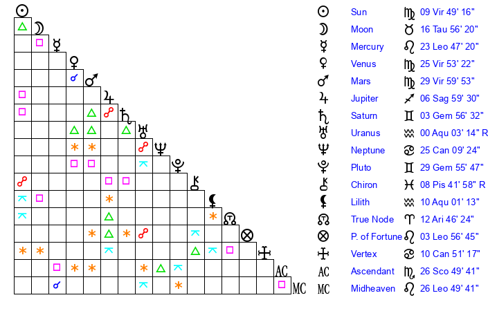 Moon | 16 Taurus 51 | 7 Capricorn 50 | 9 Cancer 33 |