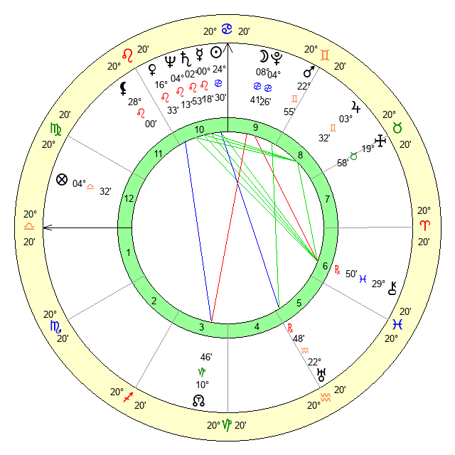 | Sun | 24 Cancer 30 | 25 Cancer 22 | 9 Scorpio 42 |