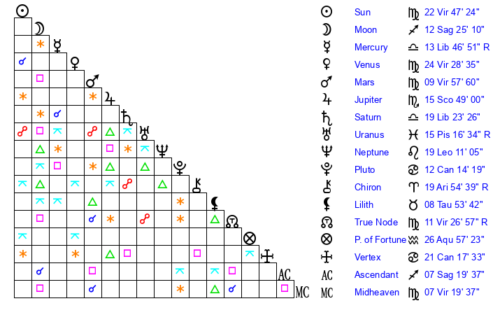 | Sun | 22 Virgo 47 | 24 Virgo 5 | 4 Capricorn 56 |