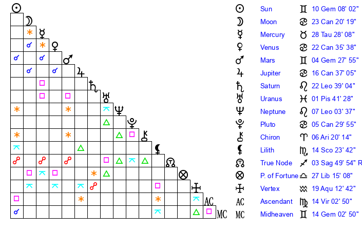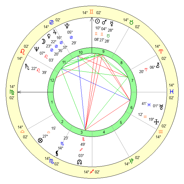 | Sun | 10 Gemini 8 | 11 Gemini 27 | 21 Virgo 47 |