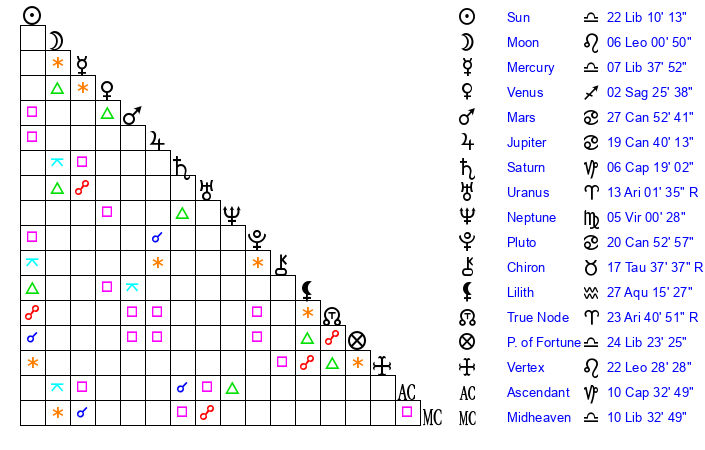 | Sun | 16 Libra 14 | 17 Libra 12 | 22 Capricorn 7 |