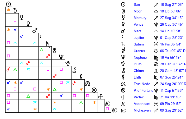| Sun | 16 Sagittarius 27 | 16 Sagittarius 51 | 16 Pisces 43 |