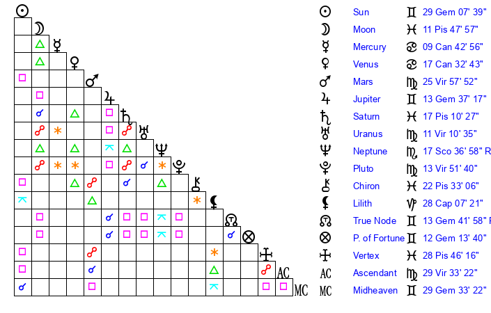 Jupiter | 13 Gemini 30 | 2 Cancer 28 | 25 Gemini 41 |