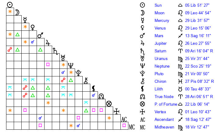 Sun | 5 Libra 52 | 6 Libra 48 | 3 Sagittarius 45 |