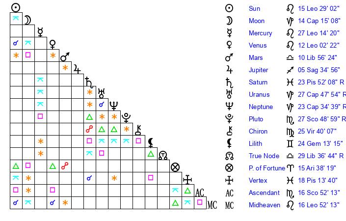 Mercury | 27 Leo 14 | 4 Leo 40 | 11 Libra 13 |