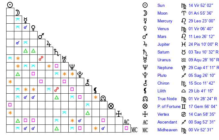 Sun | 14 Virgo 52 | 15 Virgo 19 | 11 Libra 16 |
