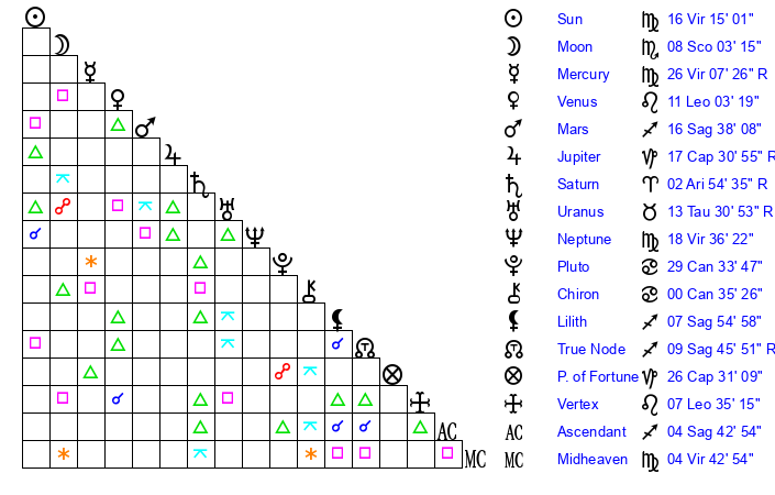 | Sun | 16 Virgo 15 | 16 Virgo 56 | 13 Sagittarius 50 |