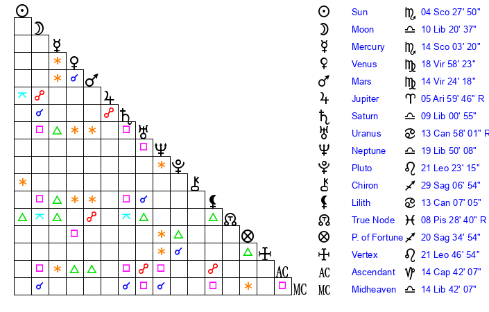 | Neptune | 19 Libra 50 | 29 Pisces 51 | 21 Libra 39 |