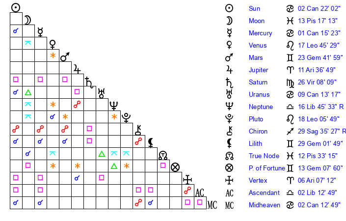 | Moon | 13 Pisces 18 | 23 Gemini 25 | 16 Scorpio 34 |