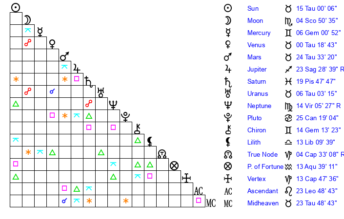 | Sun | 15 Taurus 0 | 15 Taurus 27 | 10 Leo 11 |