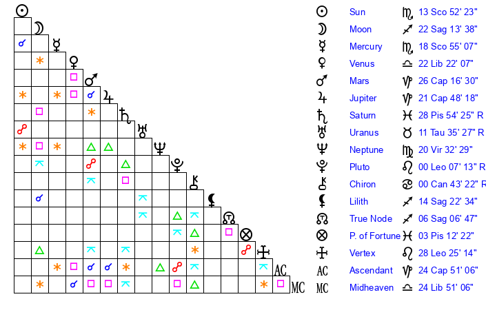 | Sun | 13 Scorpio 52 | 14 Scorpio 32 | 13 Aquarius 12 |
