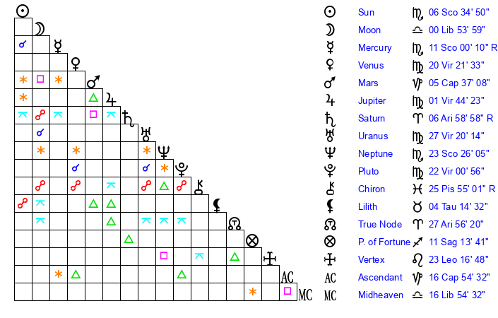 Neptune | 23 Scorpio 26 | 27 Pisces 31 | 25 Scorpio 29 |