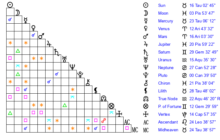 | Moon | 3 Pisces 53 | 22 Virgo 58 | 11 Pisces 30 |