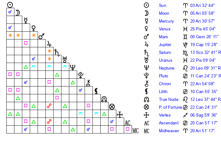 | Sun | 3 Aries 33 | 4 Aries 18 | 10 Cancer 16 |