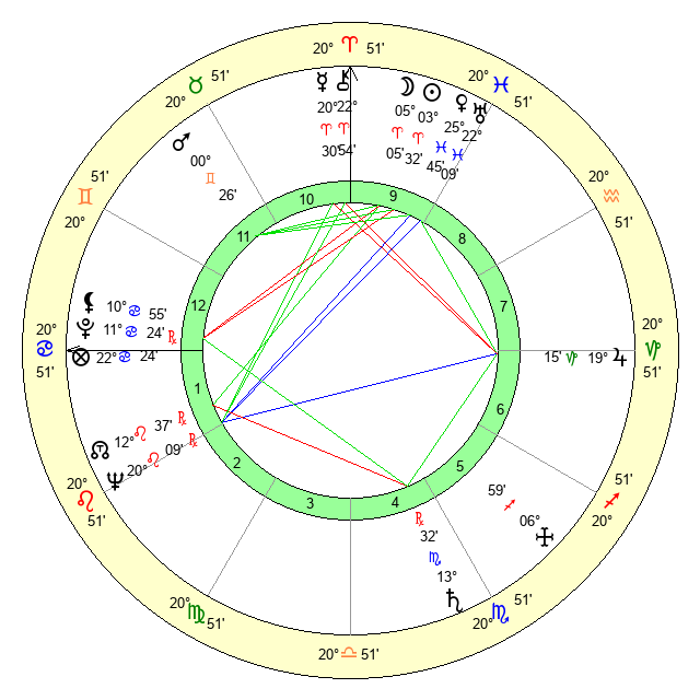 | Moon | 5 Aries 6 | 0 Aquarius 46 | 21 Scorpio 36 |
