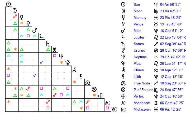 | Neptune | 29 Libra 41 | 29 Pisces 49 | 27 Libra 59 |