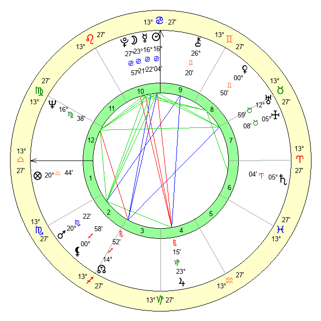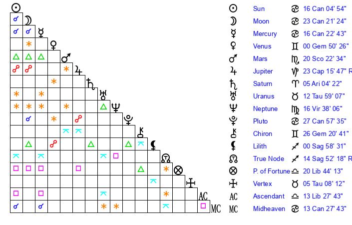 | Moon | 23 Cancer 22 | 21 Sagittarius 46 | 13 Libra 23 |