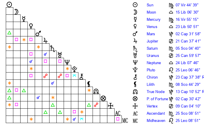 Sun | 7 Virgo 44 | 8 Virgo 32 | 17 Scorpio 46 |