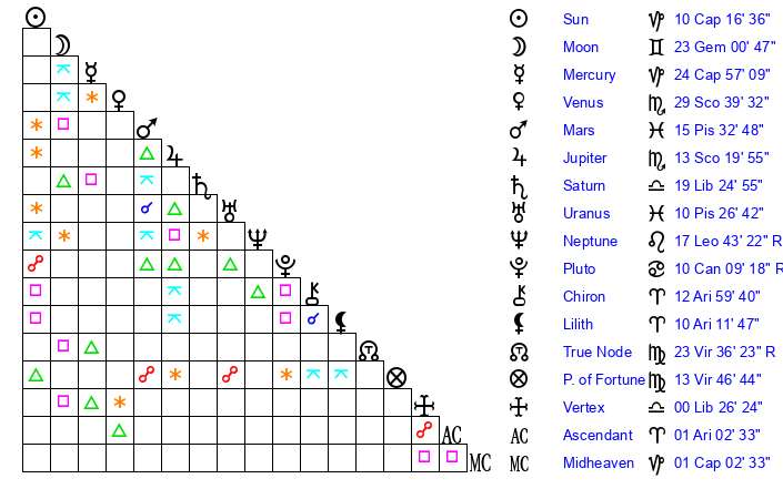 | Sun | 10 Capricorn 16 | 11 Capricorn 32 | 22 Aries 44 |