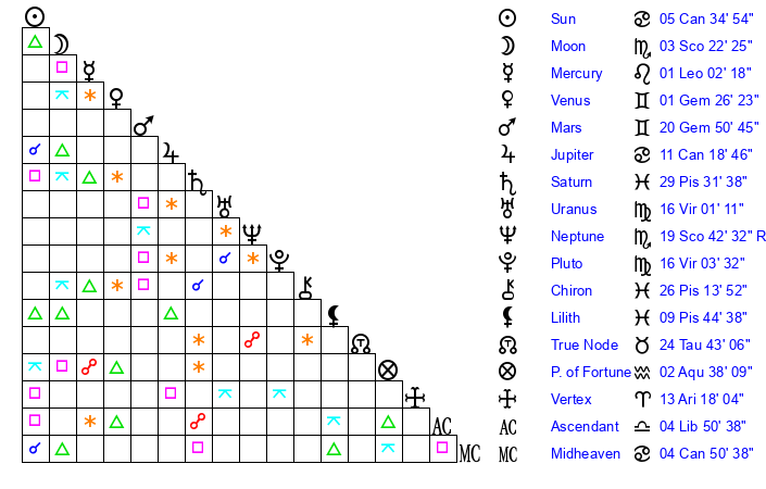 Sun | 5 Cancer 35 | 6 Cancer 18 | 2 Virgo 2 |