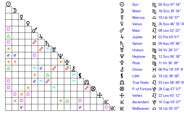 | Moon | 18 Scorpio 46 | 6 Aquarius 51 | 9 Pisces 1 |