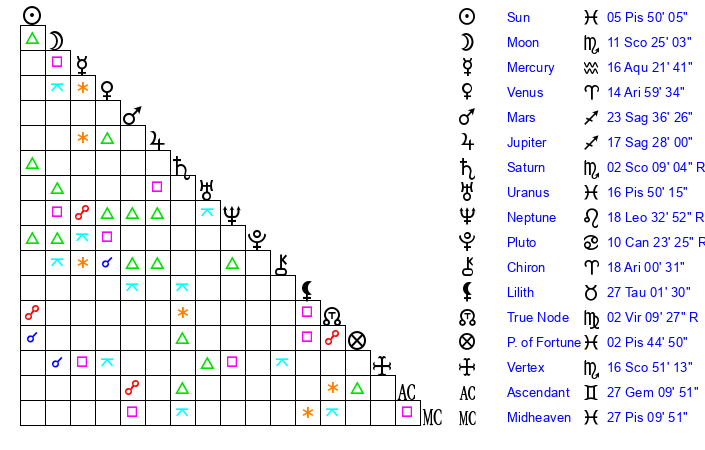 | Sun | 5 Pisces 50 | 7 Pisces 20 | 14 Gemini 43 |