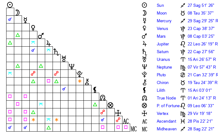| Sun | 27 Sagittarius 51 | 29 Sagittarius 18 | 1 Aries 52 |