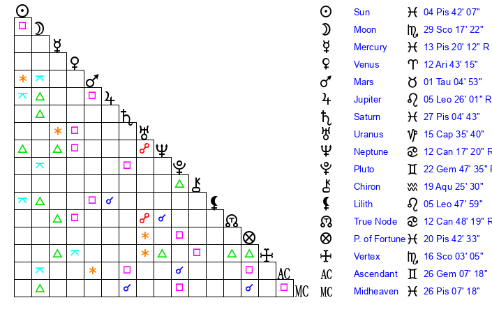 | Sun | 4 Pisces 42 | 6 Pisces 20 | 28 Gemini 55 |