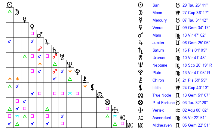 Uranus | 10 Virgo 46 | 27 Taurus 28 | 12 Virgo 22 |