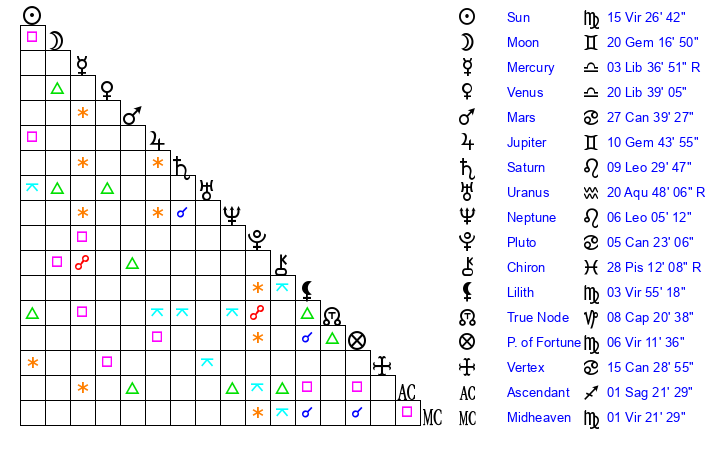 | Sun | 15 Virgo 27 | 16 Virgo 18 | 3 Capricorn 21 |