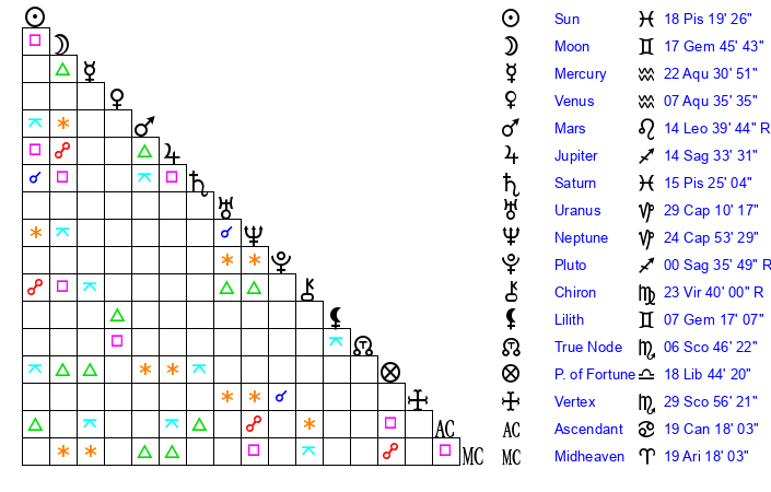 Moon | 17 Gemini 37 | 22 Cancer 27 | 19 Cancer 27 |