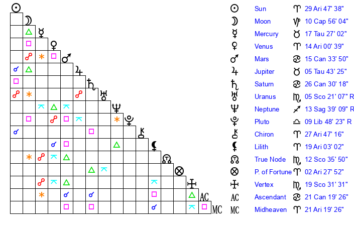 | Neptune | 13 Sagittarius 38 | 0 Aries 43 | 12 Sagittarius 27 |