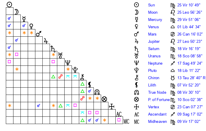 | Sun | 25 Virgo 11 | 26 Virgo 2 | 10 Scorpio 41 |